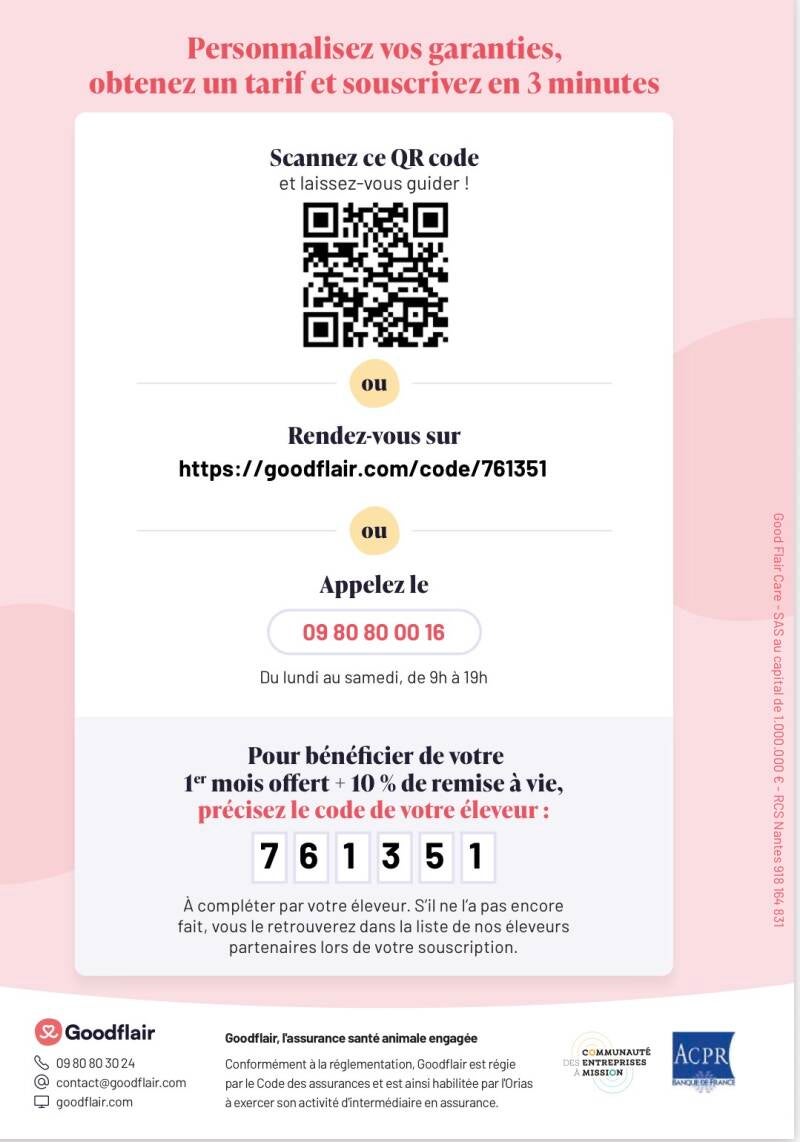 - Son certificat de bonne santé rempli par le vétérinaire de l’élevage lors de sa visite des 2 mois, il permet de faire le point sur l’état de santé de l’animal au moment du second vaccins, les oreilles, l’intérieur de la bouche, la peau, les dents, son coeur, son ventre, les articulations, son comportement général y sera inspecté. Ce document vous sera demandé par les assurances si vous souhaiter en souscrire une.